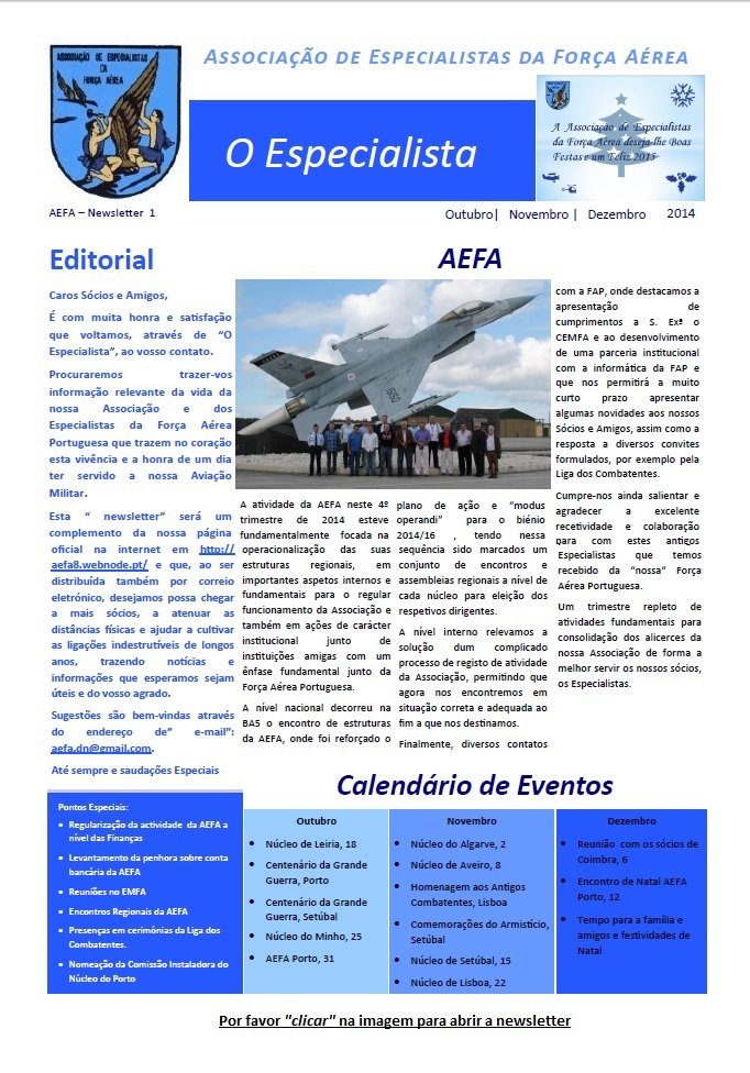 A Direção Nacional apela a uma forte participação de forma a permitir que nos encontremos todos num convívio sadio e de amizade entre todos quantos tivemos a honra e o privilégio de ter servido a Força Aérea Portuguesa como Especialistas e contribuir para uma AEFA renovada e coesa.